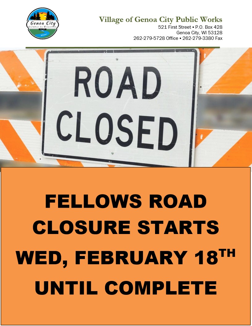 Notice 02-16-2026 : FELLOWS ROAD CLOSURE STARTS WEDNESDAY, FEB 18TH UNTIL COMPLETE.
